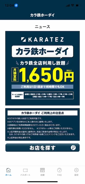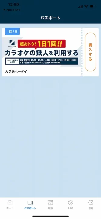 「カラテツホーダイ」公式アプリをダウンロードして、アプリからサブスク購入し、画面を見せて利用します。