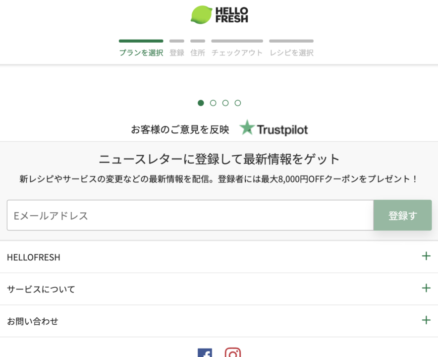 上記クーポンコードがつかえなかった 場合など、ハローフレッシュ公式サイトを下にスクロールすると、ニュースレター(メールマガジン)の登録フォームが表示されます。