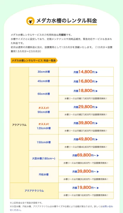 他にも大きめの水槽や、特注の水槽、水槽の引越しなど、水槽に関することなら何でも相談できる水槽レンタル業者です。対応エリアは、一都三県・大阪・広島などに限定されているので詳細は公式サイトでご確認ください。